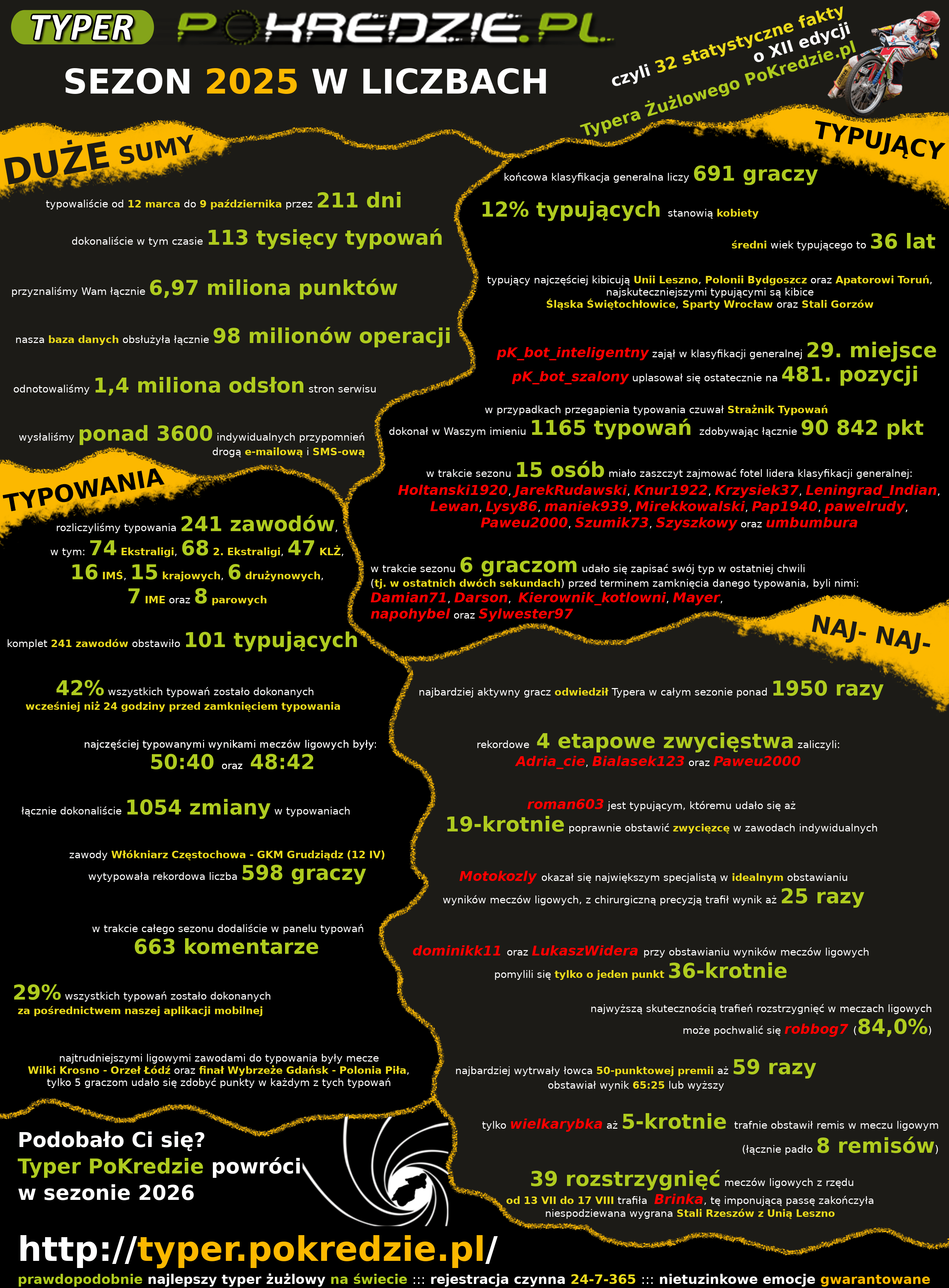 Zapraszamy do zapoznania się z najciekawszymi faktami statystycznymi sezonu 2025 w formie efektownej infografiki. Link poniżej tego zestawu ogłoszeń na tej stronie. Dziękujemy wszystkim Graczom za wspólną zabawę w sezonie 2025, a szczególnie tym, którzy mimo gorszej pozycji typowali do końca oraz 107 nowo zarejestrowanym w tym sezonie. Gratulacje dla nowego mistrza Typera @Knur1922! Rywalizacja jak co roku jest na tyle wyrównana, że żaden gracz nie załapał się na podium więcej niż jeden raz (licząc 8 klasyfikacji cząstkowych i generalną). Niebawem medaliści poszczególnych klasyfikacji i wyróżnieni w statystykach, bądź mniej typowych klasyfikacjach będą mieli możliwość pobrać okolicznościowy dyplom w formacie *.pdf. Pozdrawiamy i do typowania w sezonie 2026.